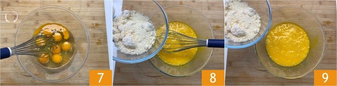 Beat with a whisk 7, then add the grated Parmigiano Reggiano PDO 8 and grated pecorino 9.