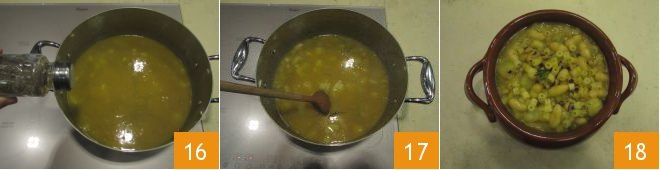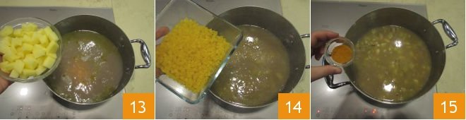 Then drain and add the potatoes as well 13. Cook for another 25 minutes or so. Adjust the amount of water or broth by adding more if it has evaporated excessively, season with the rosemary sprig and add the pasta to the pot 14. Cook for a few minutes, keeping the pasta very al dente, and lastly add the turmeric 15,