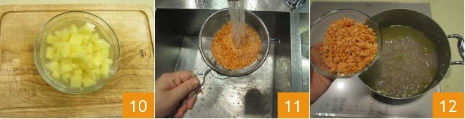 and immerse them in cold water until ready to use 10. After 50 minutes, the beans will be tender to the touch, rinse the lentils 11 and add them to the pot 12.