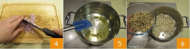 Finely chop the shallot 4, then let it wilt in extra virgin olive oil over low heat 5. At this point, add the cannellini beans and then the black-eyed beans 6 and let them season with the shallot.