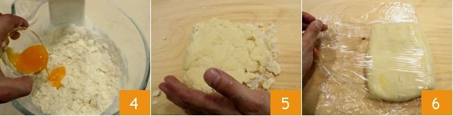 Add the whole egg and the yolks 4 (you can set aside one egg white which you will use for brushing later) and continue to work the dough; as soon as it has a less coarse consistency, transfer it to a wooden pastry board, compact the dough with your hands, trying to knead as little as possible, just enough time to absorb the dry mixture that is not yet compacted 5. Form a dough ball, flatten it slightly and wrap it in plastic wrap 6; let it rest for at least 40 minutes in the refrigerator.