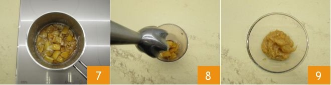 and let it cook over medium-low heat for about 30 minutes, stirring occasionally. At the end of cooking, the mixture will be thick but with some visible syrup 7: let it cool for 5 minutes before pouring it into a blender jug and then blend it with an immersion blender 8 and transfer it to a bowl 9.