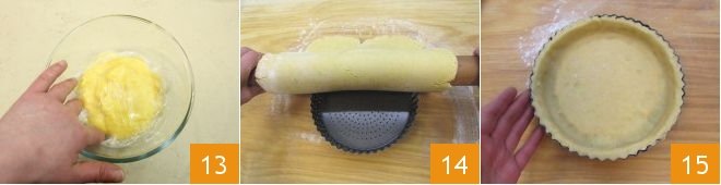 Place the cream in a bowl and cover it with plastic wrap, allowing direct contact with the surface (using wraps suitable for this purpose) to prevent a skin from forming 13. Refrigerate it. Retrieve the shortcrust dough and roll it out with a rolling pin on a slightly floured work surface to a thickness of about 1/4 inch. Place the rolled dough into an 8-inch diameter, 1.5-inch high tart pan 14 (we used a perforated pan; if you have a classic unperforated one, you should butter and flour it first to prevent sticking). Roll the rolling pin over the pan's surface to remove excess dough 15, which you can knead and roll out again,