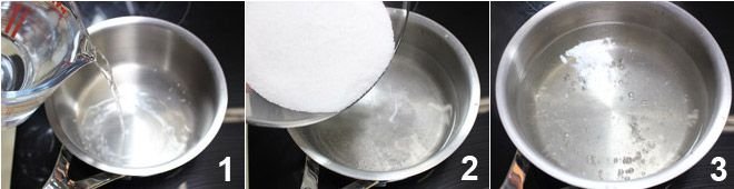 To prepare lemon granita without an ice cream maker, pour the water into a saucepan 1, bring it to a boil, and add the sugar 2. Once the sugar has completely dissolved and the liquid has become clear, turn off the heat and let the syrup cool down 3.