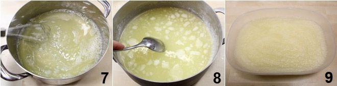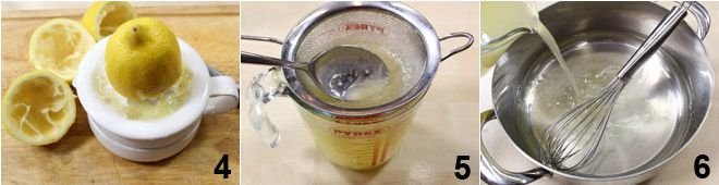 Cut the lemons in half, squeeze them with a juicer 4, and strain the juice very well using a sieve 5: you should obtain 2 cups of strained juice. Incorporate it into the now-cooled syrup 6.