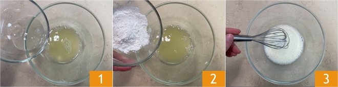 To make the lemon meringue cupcakes, start by preparing the lemon curd: in a bowl, pour the strained lemon juice, water 1, and cornstarch 2, then mix the mixture with a whisk 3.