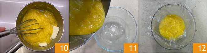 Stir to melt it completely 10, then transfer the cream to a bowl 11 and cover with plastic wrap in contact with the surface 12. Place in the refrigerator to cool for 2 hours.