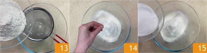 In the meantime, focus on the cupcakes: sift the flour into a bowl 13, then add the salt 14 and sugar 15.