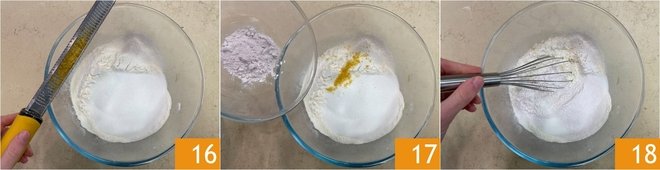 Also add the grated lemon zest 16 and baking powder 17, then mix the dry ingredients with a whisk 18.