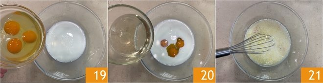 In another bowl, pour the milk, eggs 19, and vegetable oil 20, then mix the liquids with a whisk 21.