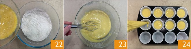 At this point, combine the liquids with the dry ingredients 22 and mix everything well 23. Line a muffin tray with paper liners and fill each one with about 2 oz of batter; to help yourself, you can use a piping bag 24. Bake in a preheated static oven at 350°F for about 20-22 minutes.
