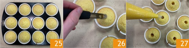 Once baked, remove from the oven and let cool 25. Once cooled, make a hole in the cupcakes with a corer 26. Retrieve the lemon curd and transfer it to a piping bag, then fill the cupcakes by filling the cavity with the cream 27.