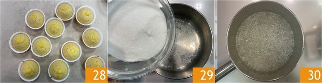 After filling all the cupcakes 28, work on the Italian meringue: in a saucepan, pour the water and 8 oz of sugar 29, then bring to a boil while monitoring the syrup's temperature with a thermometer 30.