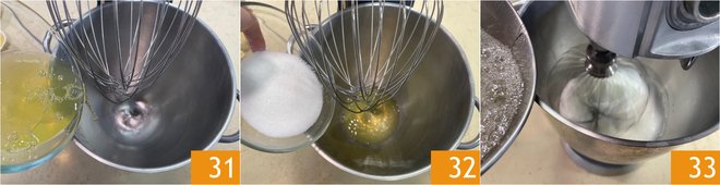 In the meantime, pour the egg whites 31 and the remaining 1/4 cup of sugar 32 into the bowl of a stand mixer fitted with a whisk and start whipping. When the syrup reaches a temperature of 250°F, pour it in a steady stream over the egg whites without stopping the whipping 33. Continue to work first at low speed and then at a higher speed until the mixture is completely cool.
