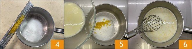 In a saucepan, put the sugar and grated lemon zest 4, then add the previously prepared mixture 5. Heat gently until the sugar is dissolved 6.