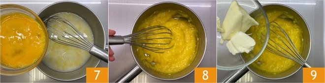 Beat the eggs in a separate bowl, then pour them into the saucepan 7 and cook for another 2 minutes, stirring continuously 8. When the mixture has thickened, add the butter 9.
