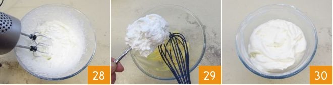 Finally, whip the cream 28 and add it to the remaining lemon cream 29. Mix the whipped cream and lemon cream with the hand whisk to make the mixture homogeneous 30.