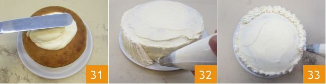 Then take the cake from the fridge and distribute part of the lemon and cream mixture, covering the entire surface evenly, using a spatula 31. Transfer the remaining cream into a piping bag with a star nozzle and create diagonal lines of cream on the sides of the cake for decoration 32. To finish the decoration, create dollops of lemon cream and whipped cream next to each other, starting from the outer edges of the cake's surface 33. Decorate the entire surface of the cake this way.