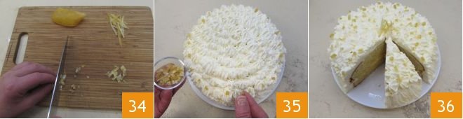 Now, on a cutting board, cut the candied lemons into small cubes 34 and scatter them over the decorated surface of the cake 35. Your lemon paradise cake is ready to be enjoyed 36!