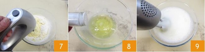 Whisk the mixture 7 until it achieves a homogeneous and compact consistency 7. Then proceed by adding a pinch of salt to the whites of 4 eggs that you set aside 8 and start whipping the egg whites until stiff 9.