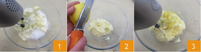 To prepare the lemon paradise cake, start with the preparation of the cake base. Combine the softened butter at room temperature with the granulated sugar in a bowl. Mix the ingredients with electric beaters until you get a creamy and homogeneous mixture 1. Grate the zest of the untreated lemons 2 and continue mixing the ingredients 3.
