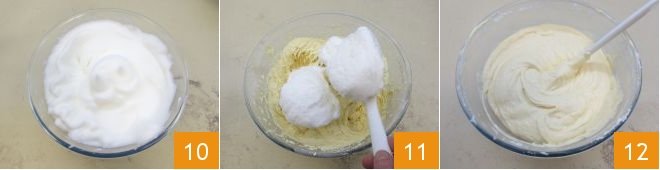 When the egg whites are stiff 10, add them to the mixture 11. Gently mix them with a spatula using an upward motion to avoid deflating them 12.