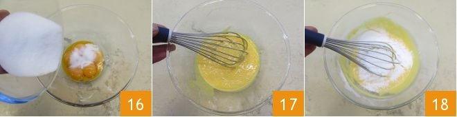 While the cake is baking, prepare the Lemon Cream. In a small bowl, pour the yolks and granulated sugar 16 and with a hand whisk, mix the ingredients until the mixture is light 17. Then gradually add the sifted flour and cornstarch and continue mixing well to get a lump-free mixture 18.