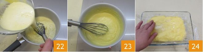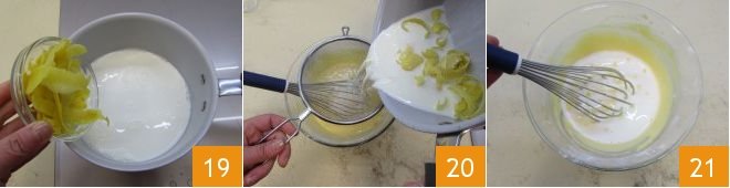 Meanwhile, heat the milk in a saucepan (it should not reach a boil), to which you add the grated zest of untreated lemon 19. Be careful to take only the yellow part of the peel because the white part has a bitter taste. When the flavored milk is almost boiling, incorporate it into the egg, sugar, and flour mixture, filtering it with a fine-mesh sieve to keep the lemon zest 20. Using a hand whisk, vigorously mix the ingredients to obtain a homogeneous and slightly thick mixture 21.