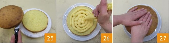 At this point, the paradise cake will have cooled. With the help of a long-blade knife, mark a guideline on the edge halfway through the cake. Then make the cut along the guideline 25. Then transfer half of the cold lemon cream into a piping bag (the other half will be used to decorate the cake) and fill the base of the paradise cake with the lemon cream. Start from the edges and proceed with concentric circles until covering the entire surface 26. Place the other half of the paradise cake on top of the lemon cream and apply very light pressure with your hands 27. Transfer the assembled cake to the refrigerator.