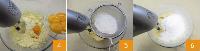 Take the eggs and separate the yolks from the whites (you will only need 4 whites, with the remaining you can prepare delicious meringues!): then add 8 yolks to the butter and sugar mixture 4, one at a time, always leaving the electric mixer running. Before adding another yolk, make sure the previously added ones are well mixed. Sift the flour and add it to the mixture 5. Still continuing to mix the ingredients with the beaters, also sift the cornstarch and baking powder into the bowl 6.
