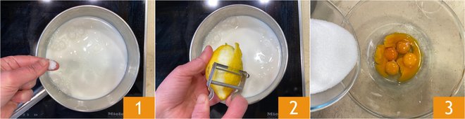 To prepare the lemon profiteroles, start with the cream: pour the milk into a saucepan, season with a pinch of salt 1 and the lemon zest 2, and bring to a boil. In a separate bowl, combine the egg yolks and the sugar 3 and whisk by hand, avoiding incorporating air.