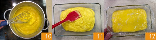 Bring to a boil over medium-low heat, stirring continuously, until you obtain a thick, lump-free consistency 10. Transfer the pastry cream to a shallow, wide container 11, then cover with plastic wrap directly on the surface 12 and let it cool to room temperature. Place in the refrigerator to set for at least 3 hours.