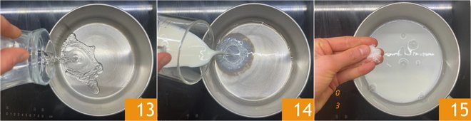 Meanwhile, prepare the choux pastry: in a heavy-bottomed saucepan pour the water 13, the milk 14 and a pinch of salt 15.