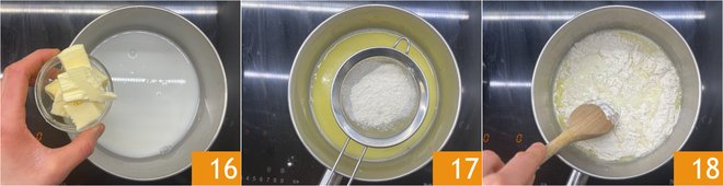 Add the butter as well 16 and let it melt over low heat. Once the butter has melted, add the sifted flour 17 and stir vigorously with a wooden spoon 18.