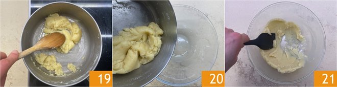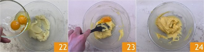 Incorporate one egg at a time 22 and mix well so they are fully absorbed 23. When you have obtained a homogeneous dough 24, transfer it to a piping bag fitted with a 12 mm plain round tip (about 1/2 in).