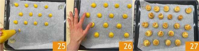 Line a baking sheet with parchment paper and pipe small mounds about 1 3/16 in in diameter 25. Moisten the tip of a finger with water and gently press the tip of each mound; this will give them a rounded shape 26. Bake in a preheated, static oven at 392°F for about 20–22 minutes. After baking, remove from the oven and let cool completely 27.