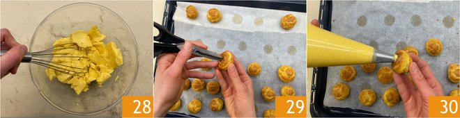 After the pastry cream has cooled, whisk it to soften 28 and transfer it to a piping bag, again fitted with a 12 mm plain round tip. Use the tip of a pair of scissors to make a small hole in the base of each cream puff 29. Insert the tip into the hole and generously fill the puffs with cream 30. The remaining pastry cream will be used for the coating.