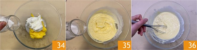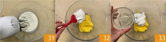 Move on to the glaze: whip 150 g of heavy cream with electric beaters 31. (150 g ≈ 5.3 oz, about 2/3 cup). In a bowl, combine the whipped cream with the leftover lemon cream 32, then add the limoncello 33.