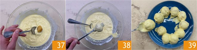 Dip a few cream puffs at a time into the glaze 37 and drain them with a fork so the excess falls away 38. Place the glazed puffs on the serving platter as you go to form the classic pyramid 39.