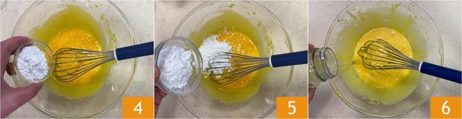 Add the cornstarch 4 and the rice starch 5. When the powders are absorbed, add the lemon juice 6 and mix again.