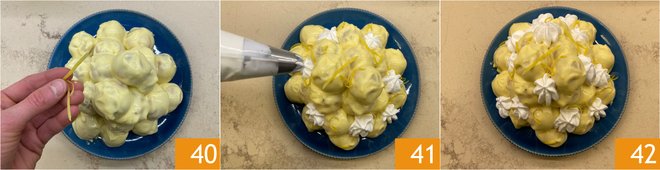 After glazing all the puffs, whip 100 g of cream for the decoration with the powdered sugar. (100 g ≈ 3.5 oz, about 1/2 cup). Garnish the pyramid of cream puffs with lemon zest strips 40 and fill the gaps with rosettes of whipped cream, using a piping bag fitted with a star tip 41. Refrigerate to set for at least 2–3 hours. Your lemon profiteroles are ready to be served 42!