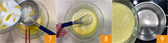 At this point, pour the hot milk into the bowl through a fine sieve 7 and blend everything with a whisk 8. Transfer the mixture to a heavy-bottomed saucepan (do not use the one in which you heated the milk, otherwise the cream may stick) 9.