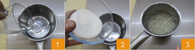 To make the lemon sorbet without egg whites, pour 200 ml (6.8 oz) of water 1 into a saucepan, add 200 g (1 cup) of sugar 2, stir and bring to a boil: you will obtain a rather liquid syrup. Let it boil for 3 minutes 3, then let it cool in the refrigerator for at least 30 minutes.