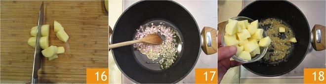 Cut into large cubes of about 1 inch 16. Now pour a drizzle of oil into a pan and stew the shallot for 7-8 minutes over medium heat. When well stewed, add the potatoes 18.