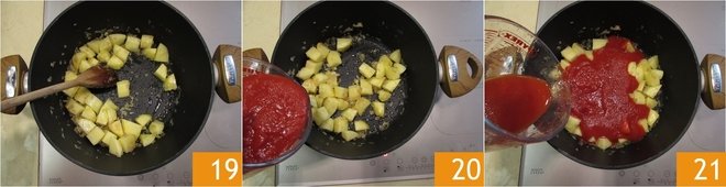 Sauté the potatoes for 2 minutes 19 and pour in the tomato puree 20. Add a little water to dilute the sauce 21.