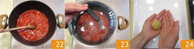 Salt, pepper, and mix well 22. Cover with a lid and let it cook for 40 minutes, stirring occasionally. Meanwhile, shape the meatballs using about 1 oz of the mixture and form into round shapes 24.