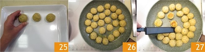 Continue this way until they are all formed, placing them one by one on a tray 25. You will get about 25. Once finished, take a non-stick pan, pour a drizzle of oil, and heat it on the stove. Place the meatballs inside and cook them for 4-5 minutes. Using a spatula, turn them gently 27.