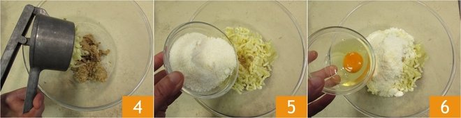 Transfer them into a large bowl, and when they are cooked, mash the potatoes inside 4. Add the grated Grana Padano PDO 5 and the egg 6.