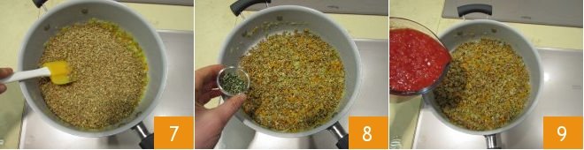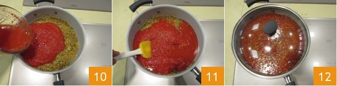 Mix everything 7 and first add the rosemary 8, then the tomato pulp 9.