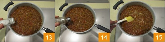 Only when the ragù is cooked, adjust the salt 13 and add the pepper 14. Mix everything 15 and your lentil ragù will be ready.